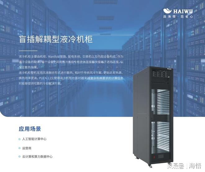 从人工智能计算中心的 “高算力集群”,到运营商的 “核心机房扩容”,再到云计算数据中心的 “高密度部署”,海悟盲插解耦型液冷机柜以广泛的适配性与卓越的性能,成为各行业高密度散热的 “优选方案”。它不仅解决了传统散热的痛点,更以 “安全、高效、经济” 的特性,助力数据中心实现 “绿色低碳” 与 “算力提升” 的双重目标,为数字经济发展注入强劲动力。